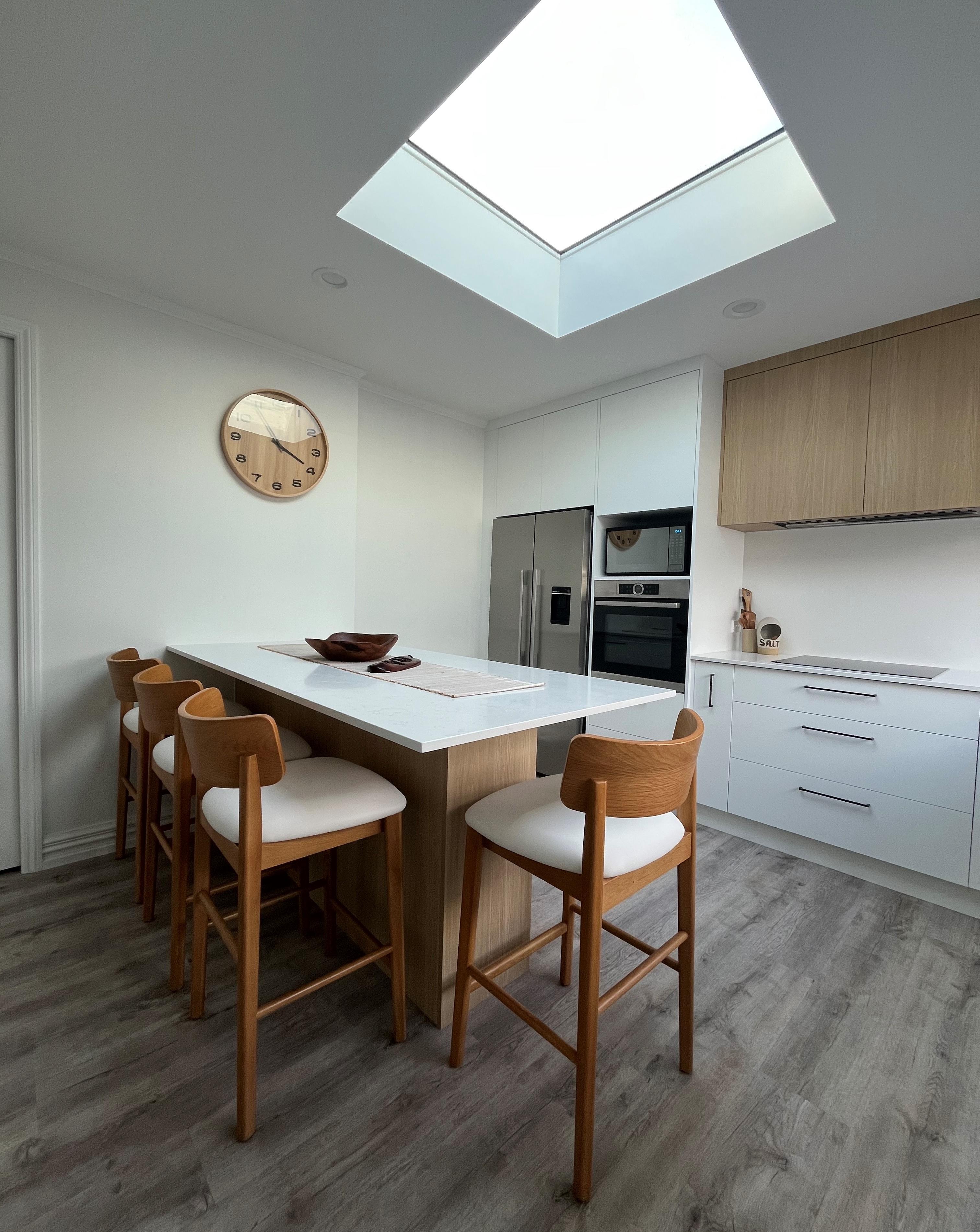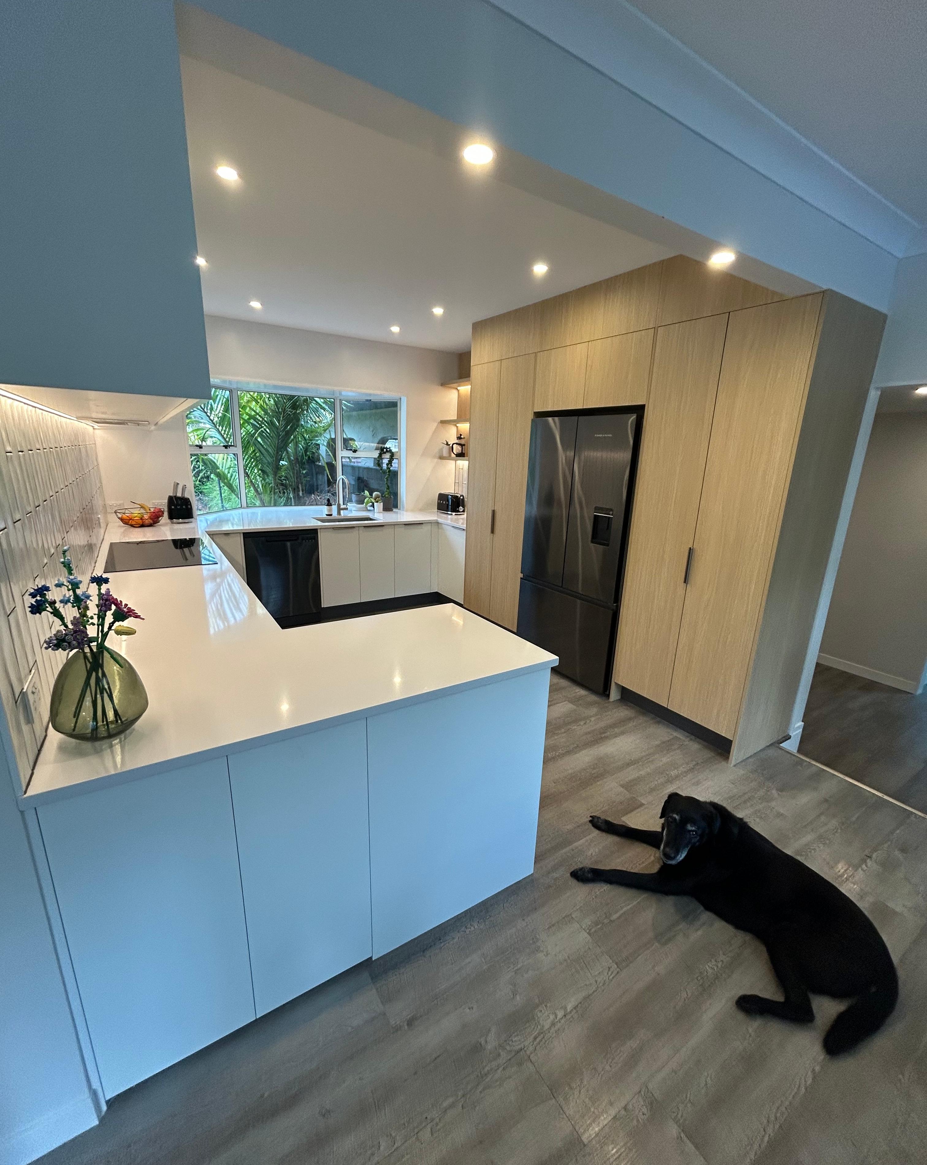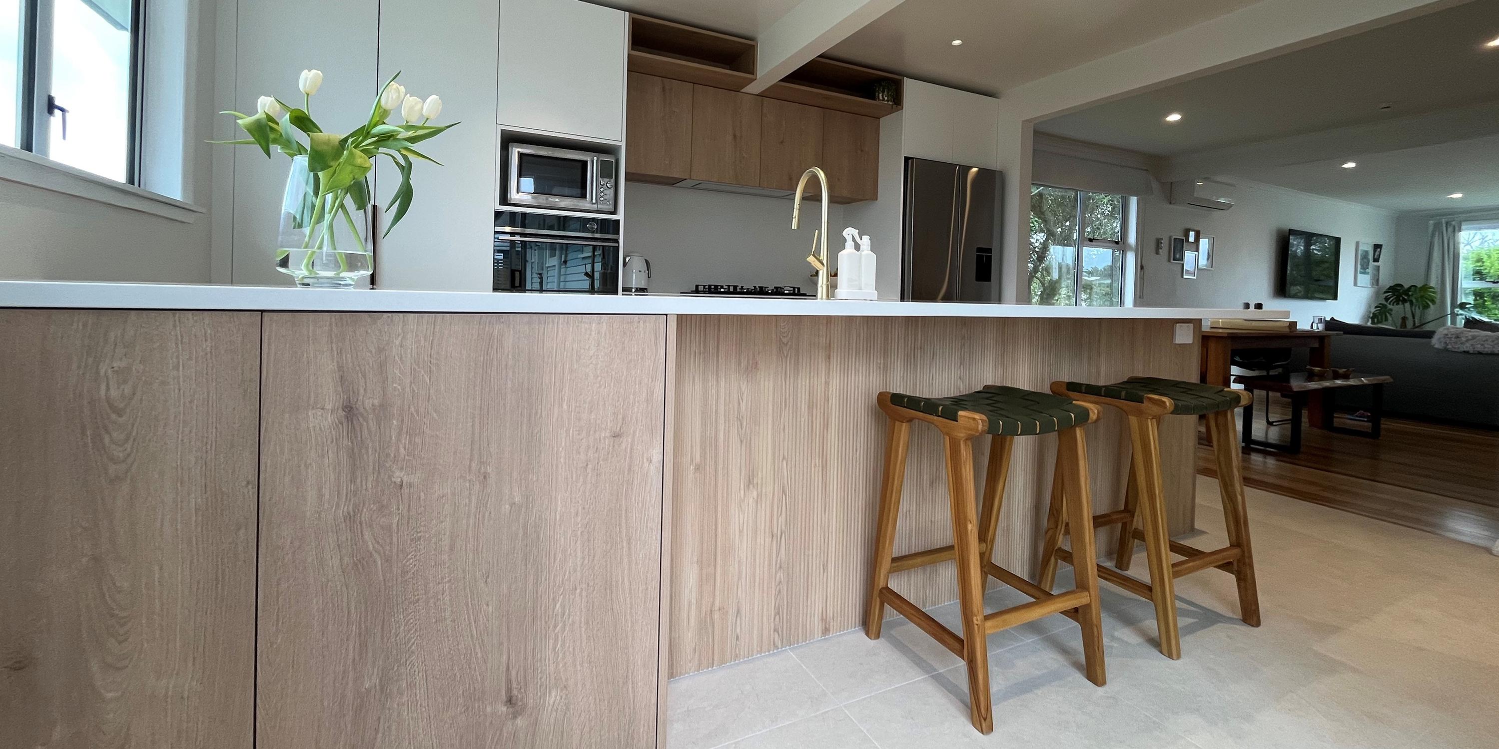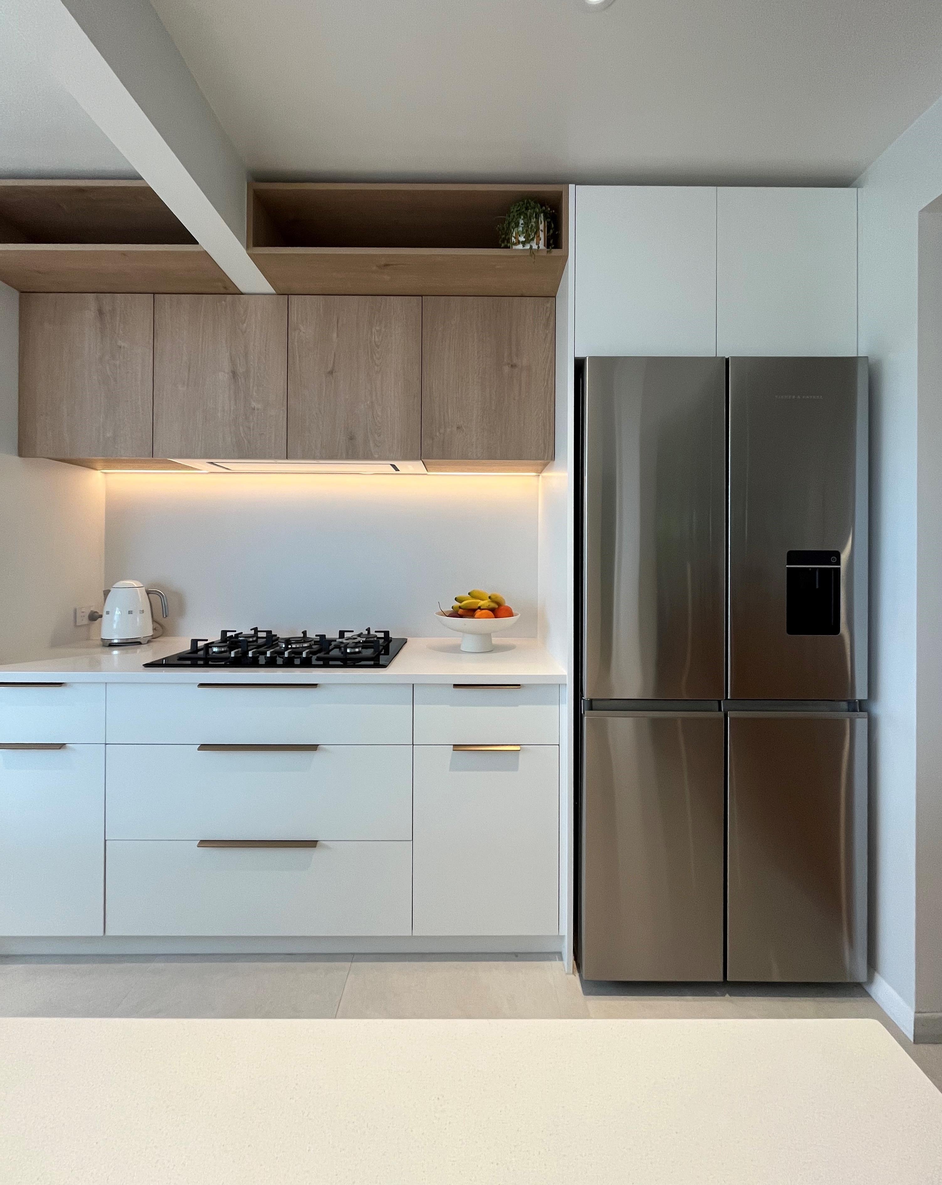 It's the next step up in finishes, including but not limited to Dezignatek thermoformed doors and panels in a huge variety of finishes, styles and colours; a granite, composite stone or stainless steel benchtop; recycling double pull-out bins; overhead cabinets; and internal drawer fittings.
